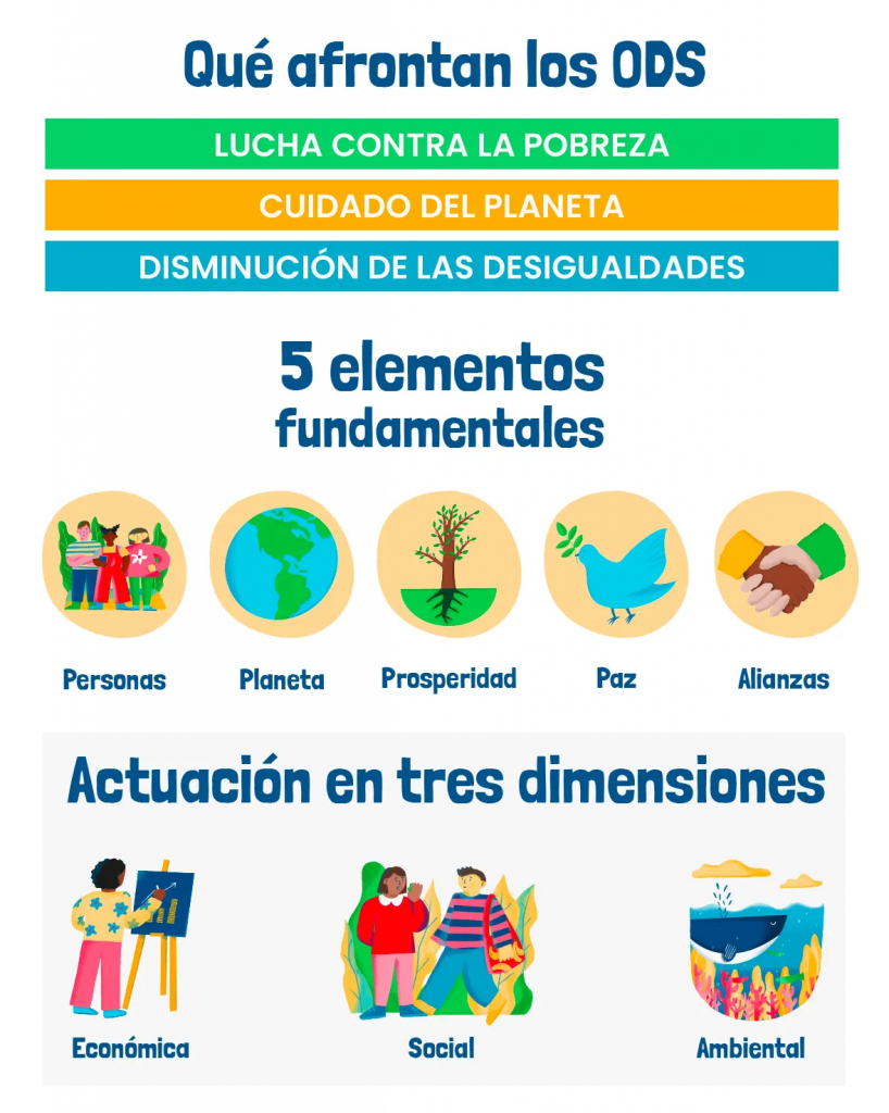 La Agenda cuenta con 17 Objetivos de Desarrollo Sostenible, que establecen que la erradicación de la pobreza debe ir de la mano de estrategias que fomenten el crecimiento económico y aborden una serie de necesidades sociales como la educación, la sanidad, la protección social y las perspectivas de empleo, al tiempo que se combate el cambio climático y se protege el medio ambiente.